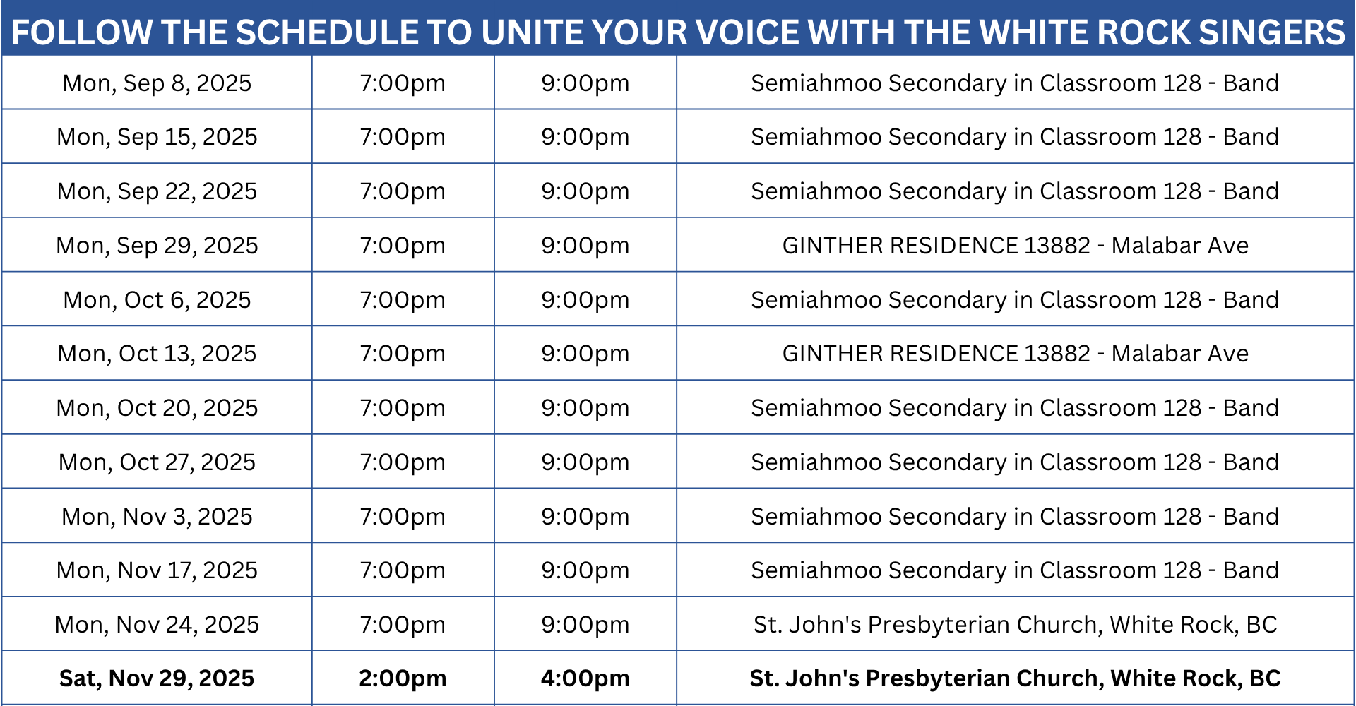 Join us on our musical adventure and stay connected for a harmonious journey through captivating concerts, uplifting workshops, heartwarming performances, and more with the White Rock Singers. Experience the magic of music and become a part of our vibrant community today!